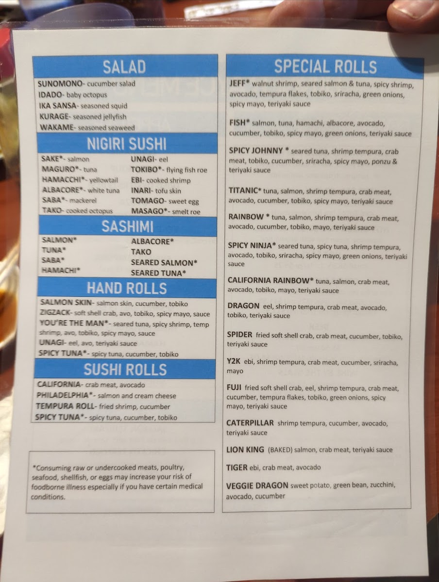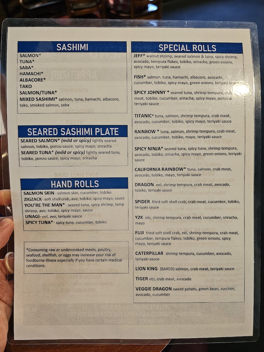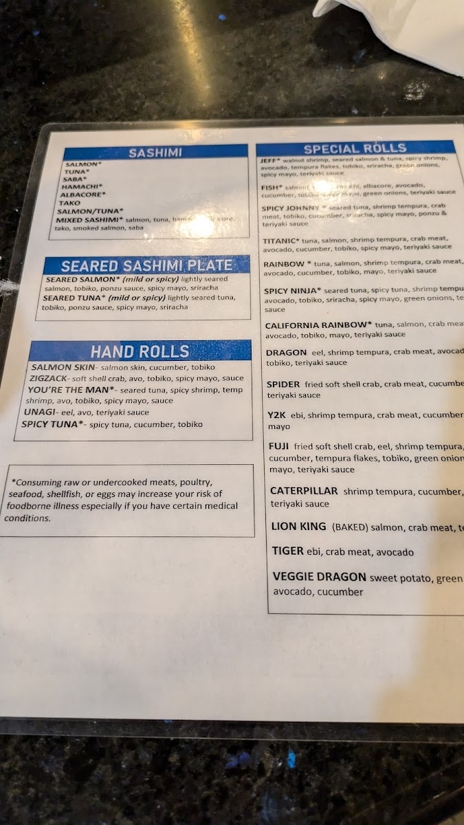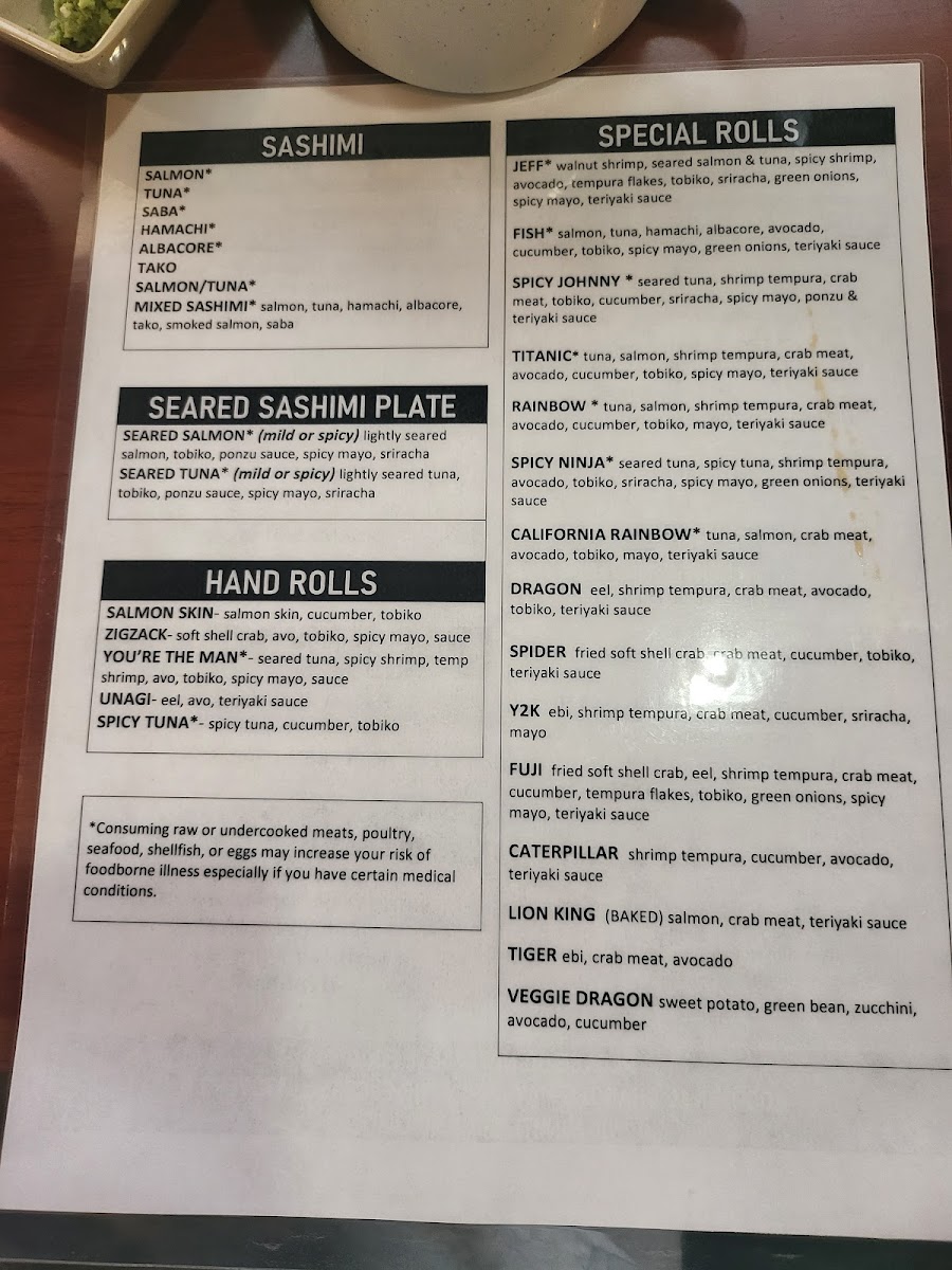 Includes titanic roll (fried shrimp, crab meat, tuna, salmon, cucumber, avocado, tobiko, spicy mayo, teriyaki sauce), Jeff roll (walnut shrimp, seared salmon, seared tuna, spicy shrimp, spicy mayo, sriracha, tobiko, tempura flakes, avocado, green onion, teriyaki sauce), caterpillar roll (fried shrimp, avocado, cucumber, teriyaki sauce), potstickers (six pieces), edamame.