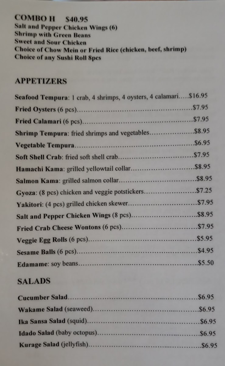 Salt and pepper wings (6), shrimp with green beans, sweet and sour chicken, choice of any chow mein or fried rice (chicken, beef, shrimp) and choice of any sushi roll (eight pieces).