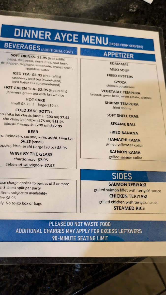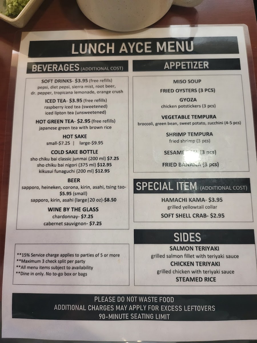 Includes spider roll (fried soft-shelled crab, crab meat, cucumber, masago, teriyaki sauce), Y2K roll (fried shrimp, crab meat, cucumber, ebb, sriracha, mayo), 10 pieces mixed sashimi, potstickers (six pieces), edamame.