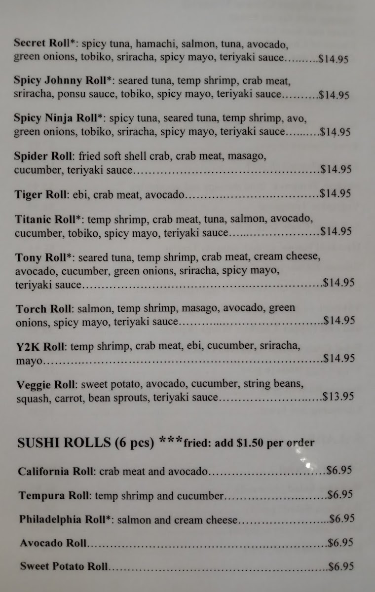 Fried, spicy tuna, cream cheese, jalapeno, green onions, tobiko, spicy mayo, and sriracha
